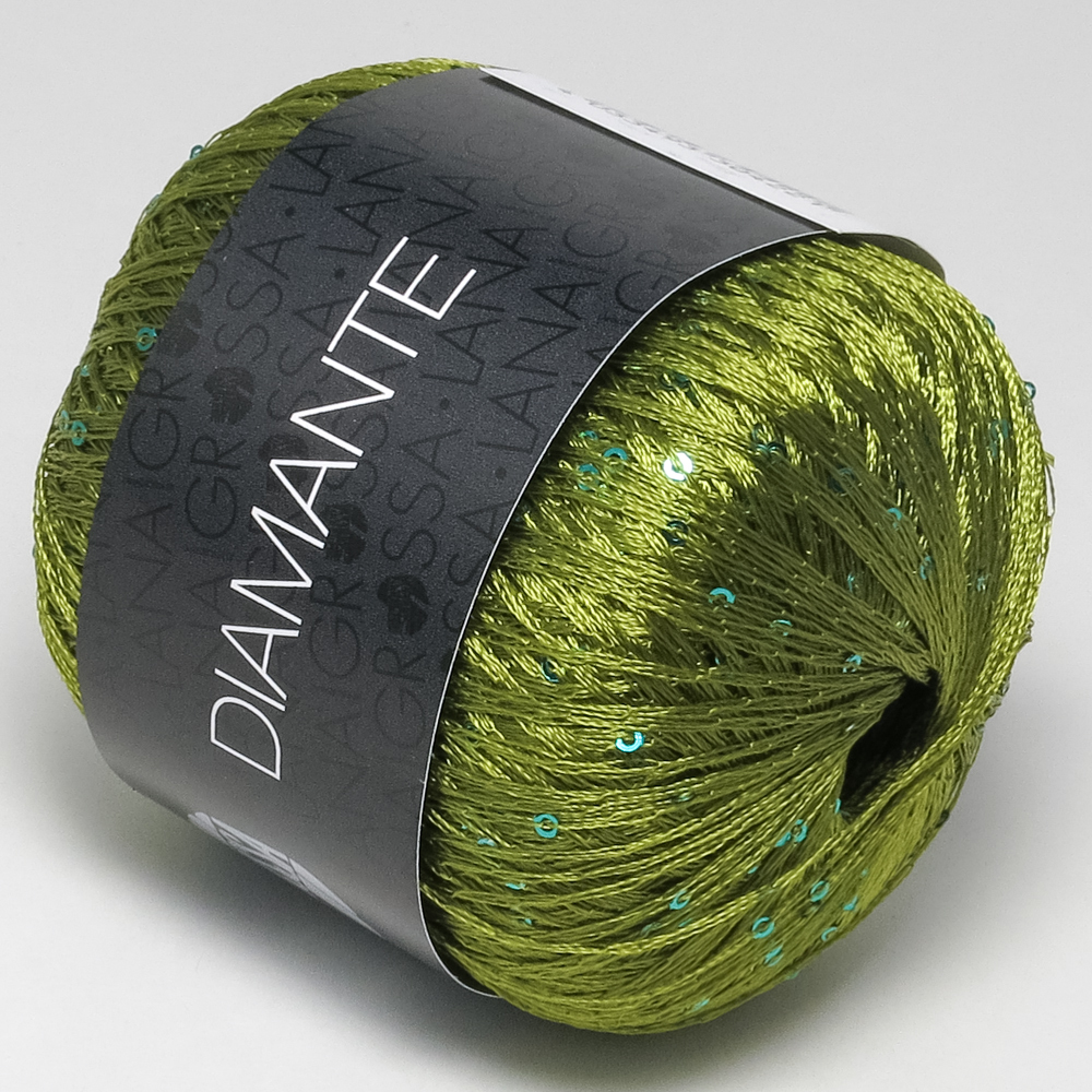 А также 200 (225) 250 г оливковой (цвет № 19) пряжи 2 LANA GROSSA “Diamante”: 100% полиэстер; 195 м/25 г.