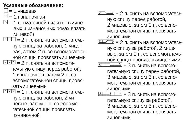 Узор «Косы». Количество петель кратно 22 + 4. Вязать по схеме А. На ней приведены только лицевые ряды; в изнаночных рядах все петли вязать по рисунку или так, как указано в «Условных обозначениях». Повторять 1-6-й ряды.